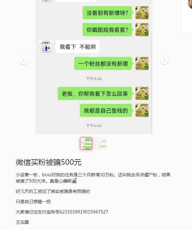 微信買粉被騙500元 小運(yùn)營一枚,boss對(duì)我的任務(wù)是三個(gè)月新增30萬粉。還叫我去買點(diǎn)僵尸粉,結(jié)果被騙了500大洋。真是心痛啊 好幾天的工資沒了其實(shí)被騙是有預(yù)感的 https://www.xiaohongshu.com/discovery/item/624d6364000000002103472f 只是自己想賭一把