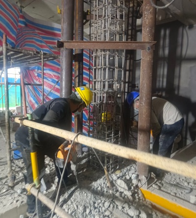 植筋與鋼筋綁扎: 在原構(gòu)件上鉆孔植筋(作為連接筋),綁扎新增的受力鋼筋和箍筋,確保新舊鋼筋連接可靠。